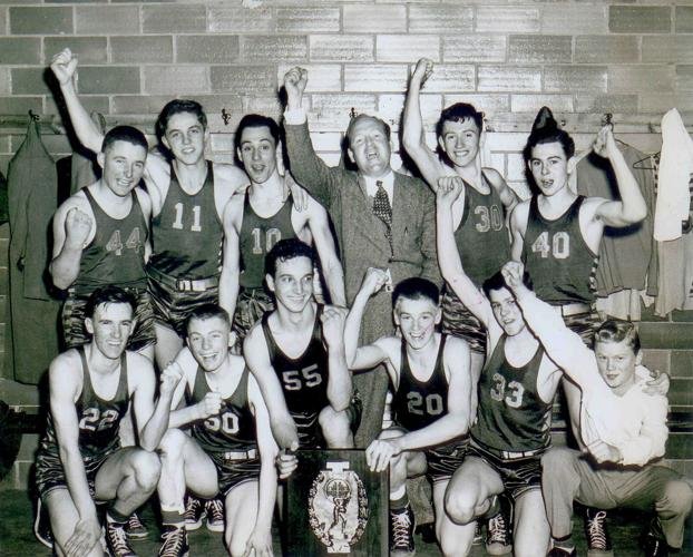 Members of the 1948-49 New Athens High basketball team. TOP ROW: (44) Jim Womack, (11) Charles Schreiber, (10) Bob Klingenfus, Coach Lonnie Woods, (30) Bill Hoffman, (40) Dale Schneider. BOTTOM ROW: (22) Ardell Schoep, (30) Jim Schmulbach, (55) Bud Wirth, (20) Relly (Whitey) Herzog, (33) Bob Waeltz, Don Ragland.